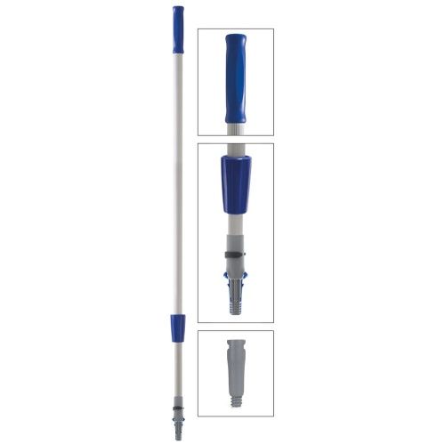 Hliníková teleskopická násada s gumovou rukojetí. Pomocí plastových aretací lze násadu zafixovat v požadované délce. Ukončena euro závitem k upevnění na jakýkoli čistič oken...